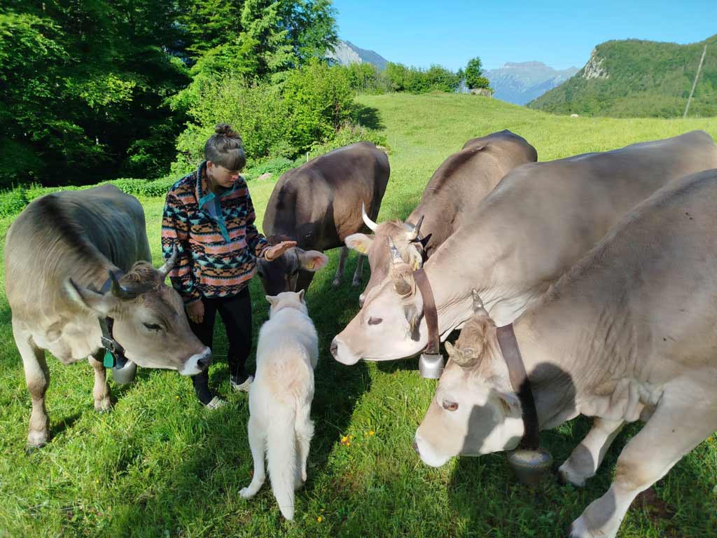 Nous avions entendu les cloches de vaches d’alpage la veille au soir alors nous décidons de les trouver avant de reprendre la route. L’expérience est folle… mais s’avère au final dangereuse! Lionel est agriculteur et s’assure avant toute chose qu’il n’y a aucun veaux, ni taureaux. Ce sont des génisses (jeune vache qui n’a pas encore eu de veau). Nos chiens sont habitués, c’est ok, alors nous rentrons dans le parc à vache.