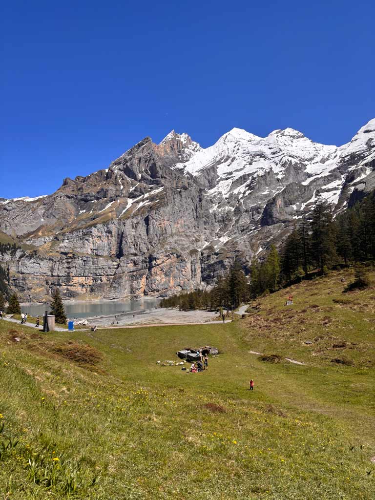 Sous un soleil de plomb mais protégé par nos casquettes, crème solaire et multiples bouteilles d’eau dans nos sacs, on s’attaque à 500m de D+ d’une traite. Pour information, le lac d’Oeschinen est également accessible en funiculaire. Je ne vous le cache pas, enceinte de plus de 6 mois, j’en chie! Il y a aussi beaucoup de monde et ce n’est pas toujours facile de trouver un coin tranquille où faire une pause.