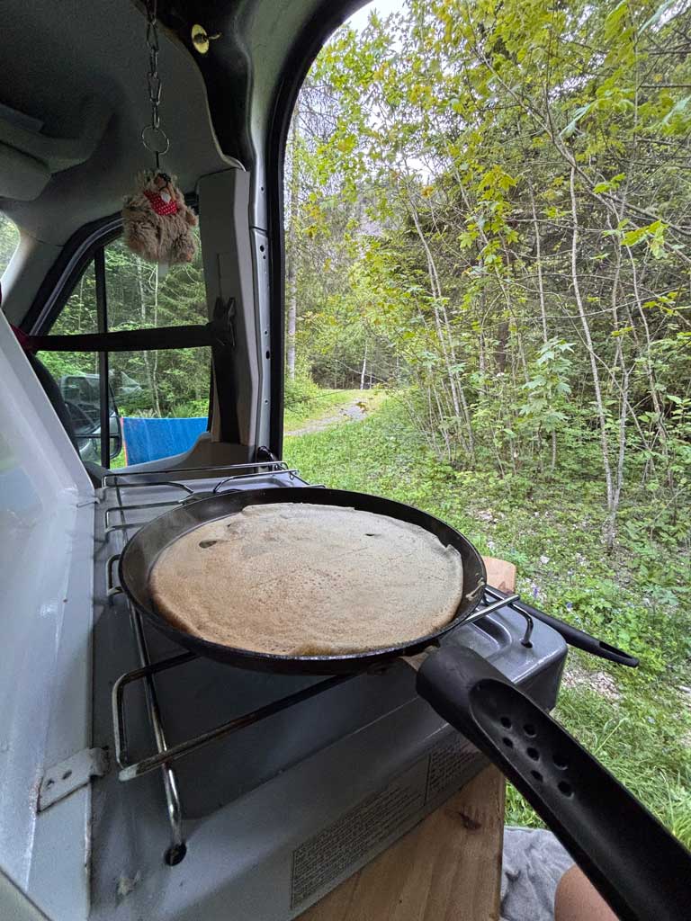 Cette fois-ci, nous trouvons un spot de dodo ULTRA facilement à côté d’une voie ferrée et d’un cours d’eau. J’avais promis des crêpes pour le dessert (l’ado s’en est souvenu), je m’attaque donc à leur cuisson pendant que les hommes se lavent. Oui, là, on a insisté pour que tout le monde se douche avant de dormir.