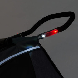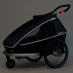 Une cellule de sécurité passager forme un cocon protecteur autour de votre loupiot. Pour la visibilité, une bande réfléchissante illumine le contour de la remorque à la tombée de la nuit. De même sur le guidon, un éclairage automatique intégré s’active quand vous roulez dans l’obscurité. Des lumières rouges et blanches restent allumées durant 4 minutes à l’arrêt. Grâce à cette luminosité, vous restez visibles pendant que votre kid sort de sa remorque. Un frein de sécurité empêche la remorque cyclable de reculer ou d’avancer quand vous stationnez.
