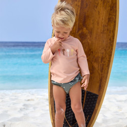 Ce joli petit maillot de bain sert aussi de couche ! Avec son système breveté unique de doublure absorbante, il garde les fesses de votre petit bout au sec hors de l’eau et retient les accidents durant la baignade.